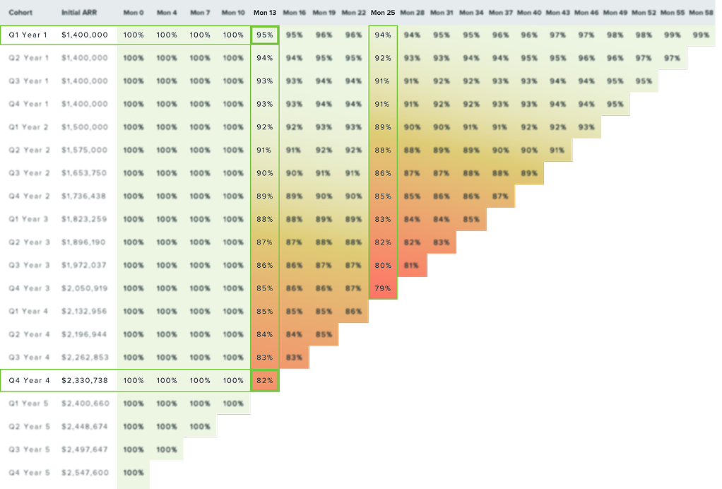 Now here is a different view of the same data, segmented by acquisition quarter and plotted longitudinally over quarterly intervals. In enterprise businesses with annual contracts, we recommend focusing on renewal cliffs – month 13 (M13), month 25 (M25), etc.. Below we can see recent cohorts eroding quickly at the renewal points. Month 13 dollar retention is 95% for the Year 1 Q1 cohort, but just 82% for customers acquired in Year 4 Q4.