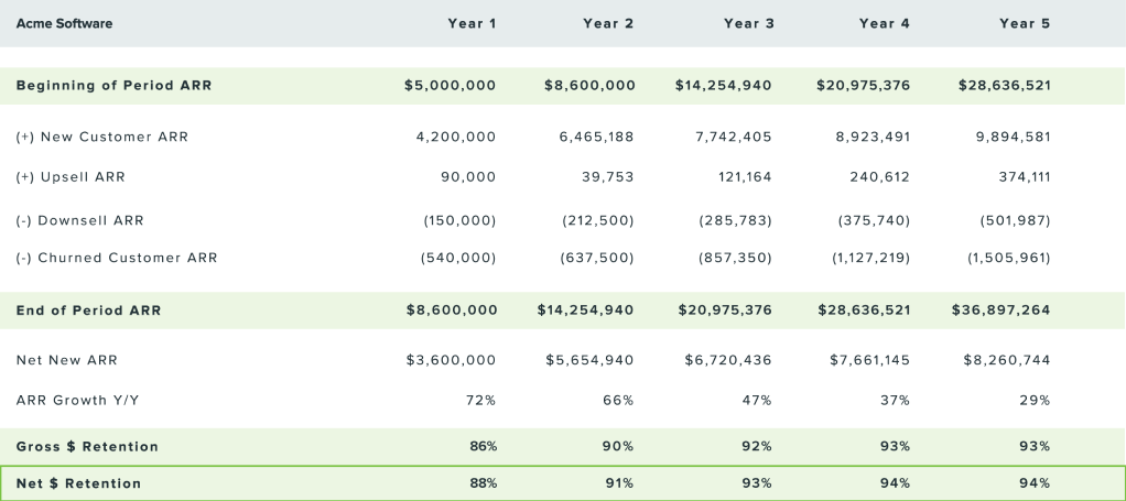 Acme’s snowball net dollar retention begins at 88% and steadily improves over the 5 year period, ending at 94%. Although Acme is below the coveted 100% net dollar retention level, it appears to be a healthy company trending in the right direction.