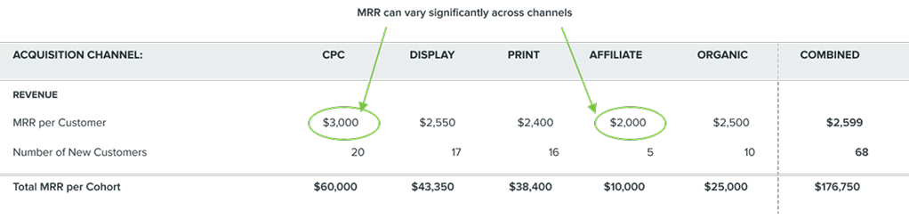 MRR is the average monthly recurring revenue per customer. While company-level MRR explains average monthly recurring revenue across the entire customer base, it ignores variability across vintage, channel and product cohorts. For example, different products have different economics – a $300 basic product should not be lumped in with a $1,500 premium offering when assessing MRR. Also, tracking MRR over time within an individual cohort will illuminate upsell/downsell trends – a significant factor in the efficacy of the SaaS business model.