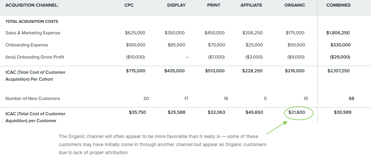 Two difficulties encountered when isolating tCAC by cohort are attribution and cost allocation. Attribution is difficult, especially in marketing, because spend in one channel often drives the end result in another. For example, a display advertising campaign may generate customer interest that results in a sale through an affiliate channel. These untraceable accounts often fall into the “organic” channel, inflating its apparent efficacy.