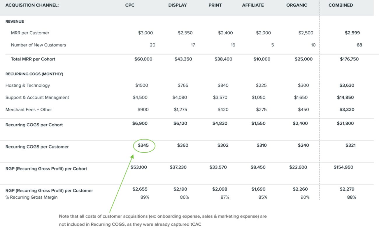 The key to properly calculating recurring COGS, and consequently RGP, is to include all month-to-month costs required to maintain a customer that is already live on the software, but to exclude the initial expenses necessary to light up a new customer; those one-time expenses were captured in tCAC. There will be a mixture of fixed COGS (e.g., servers) and variable COGS (e.g., merchant fees) captured in this bucket of costs.