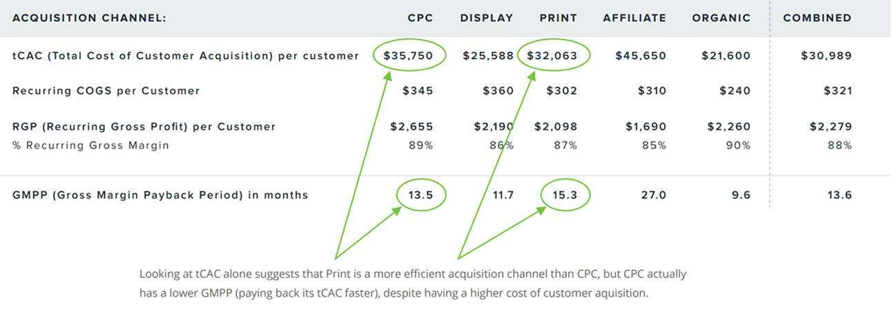 Lastly, tCAC must be reported by cohort in order to properly represent the cost of acquiring specific customers rather than a generalized “average” customer. In Figure 2 we show tCAC by channel.