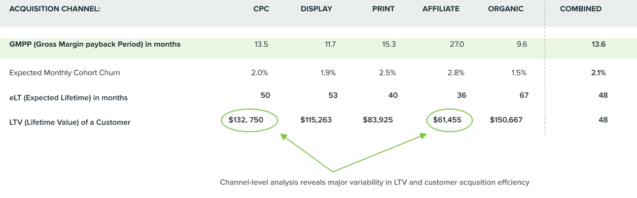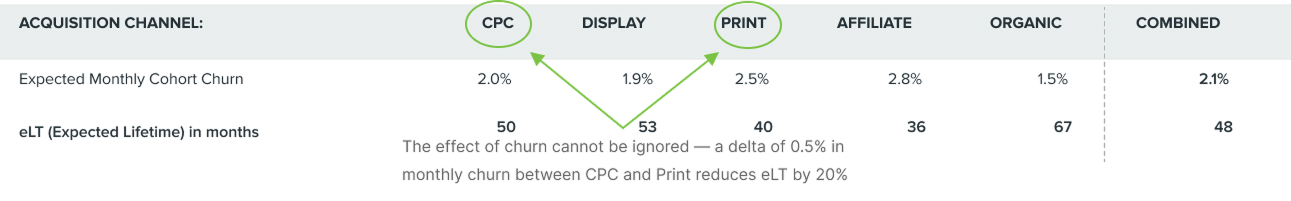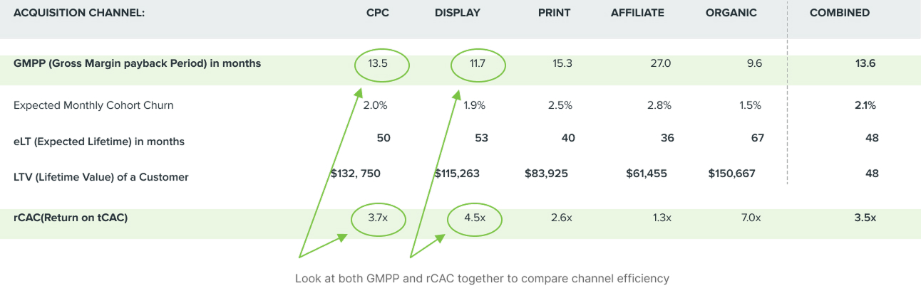 By utilizing GMPP and rCAC together, we can determine the time required to recoup the cost of acquiring a customer and the expected return on acquisition spend. The two metrics together are crucial when making decisions about the most efficient ways to allocate resources. A cohort with a rapid GMPP but low rCAC ultimately means little profit will be realized from customers because they churn soon after the breakeven point. Conversely, a cohort with great rCAC but very long GMPP creates a substantial need for capital to weather the storm until it becomes profitable.